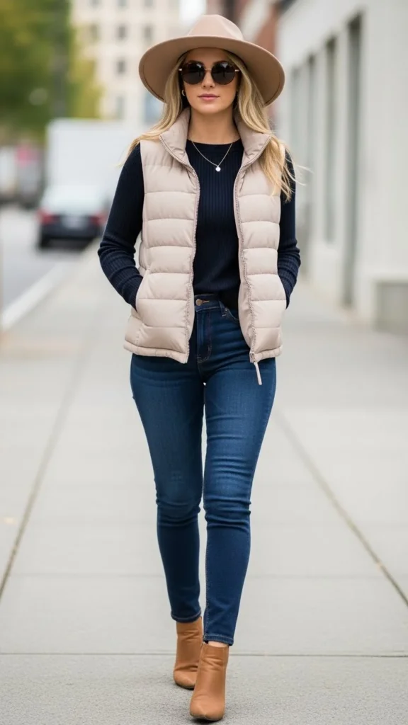 A vest over a tee adds structure without sleeves. Neutral colors work best.