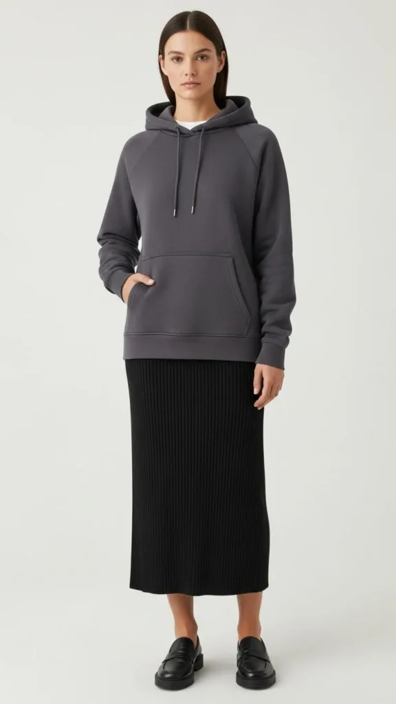 A plain hoodie paired with a midi skirt blends comfort and shape. Choose hoodies without graphics for a cleaner feel.