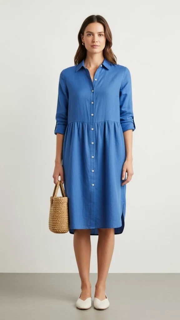 A linen shirt dress works well for daily wear. Wear it loose or add a simple belt.