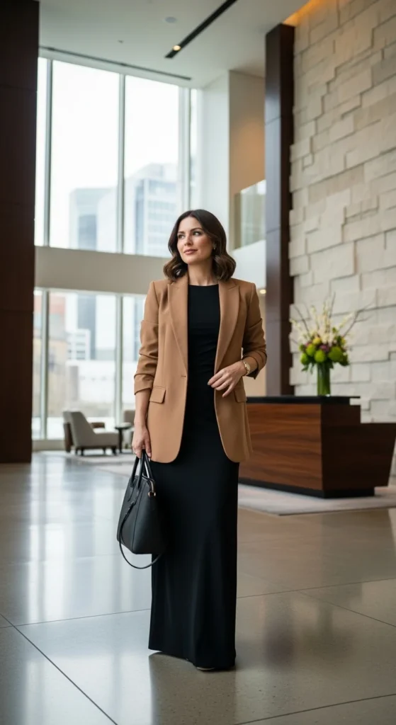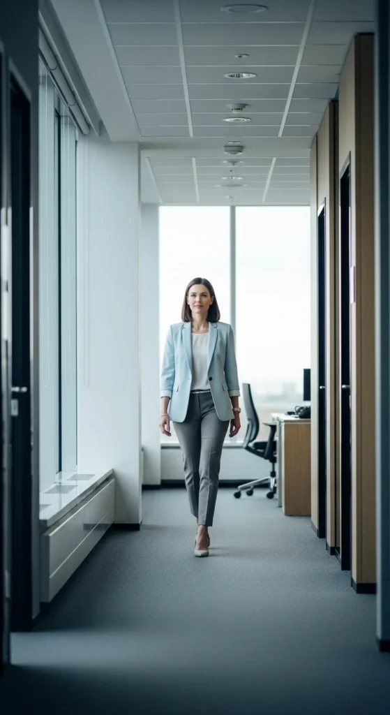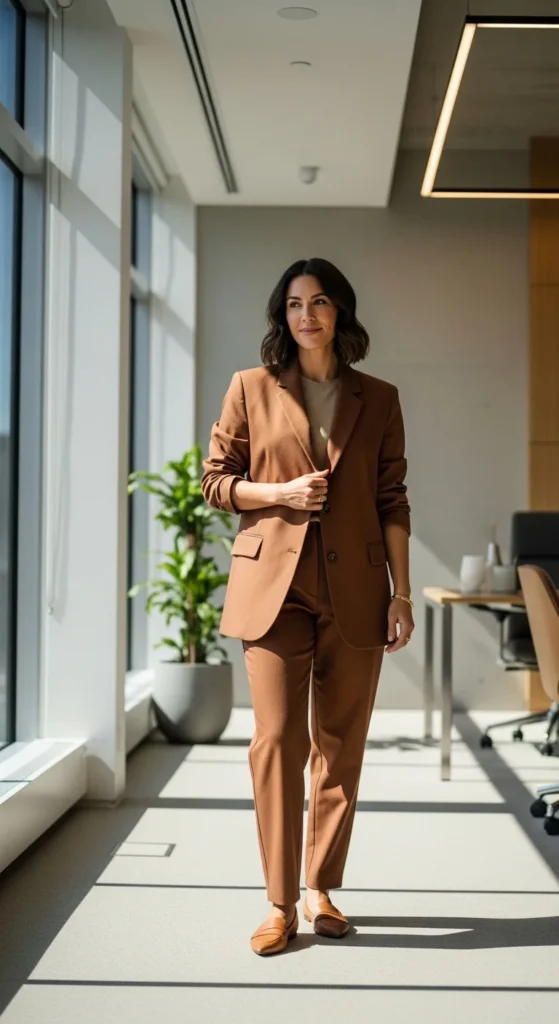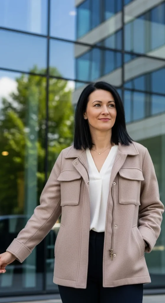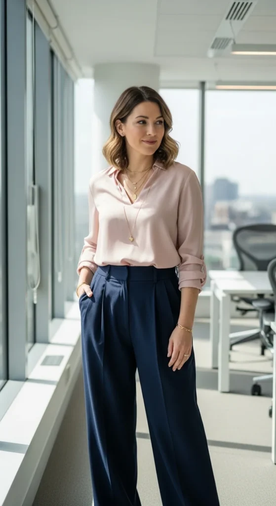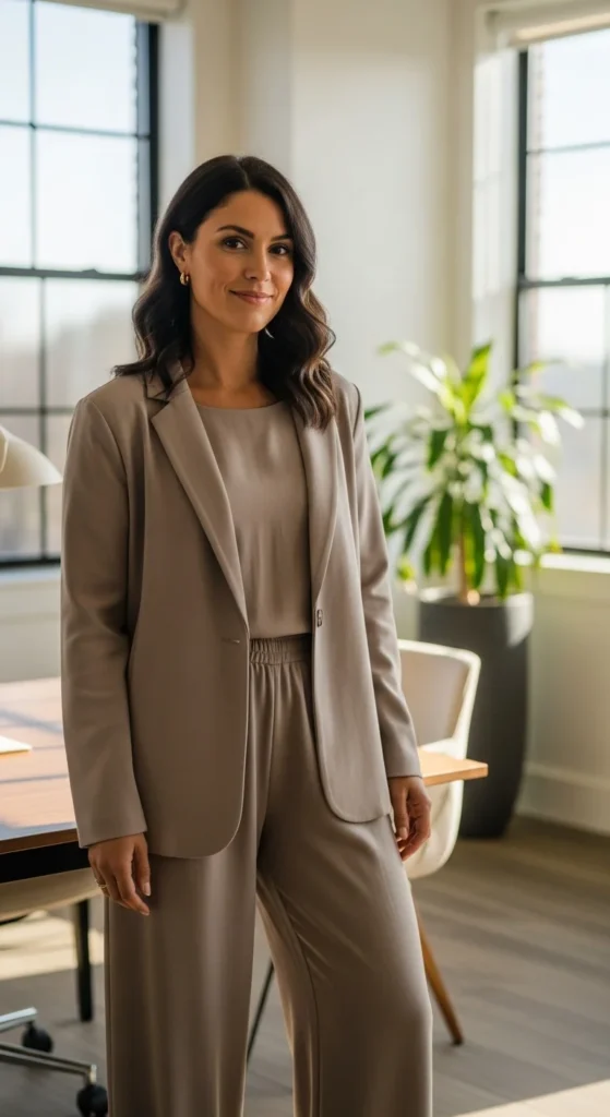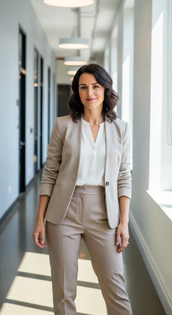 A soft-shoulder blazer gives structure without stiffness. Choose lighter fabrics that move easily. Pair it with straight trousers for a clean, balanced silhouette that works across departments. Neutral colors help the outfit repeat through the week.