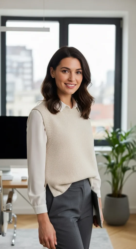 Vests add structure without bulk. Choose soft fabrics and neutral shades.