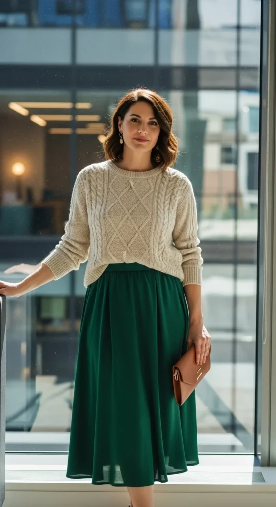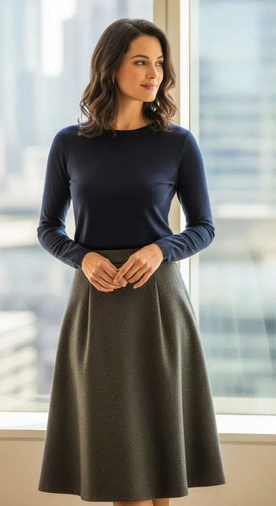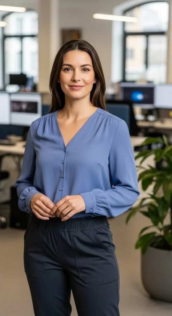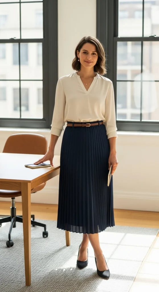 Look for lightweight fabrics that move well. This outfit works with flats or low heels and feels appropriate across many office settings.