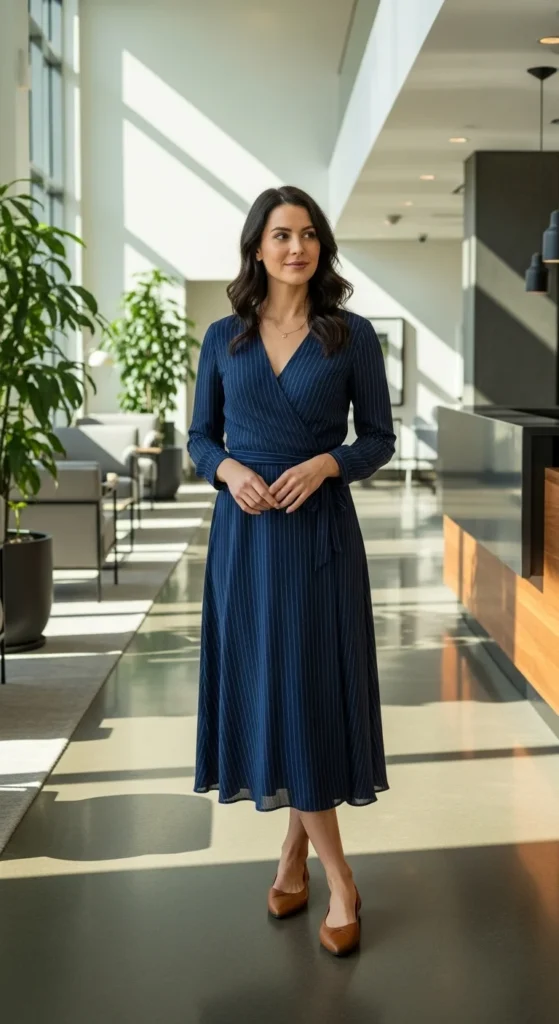 Wrap dresses adjust easily and feel comfortable throughout the day. Choose muted colors for work settings.