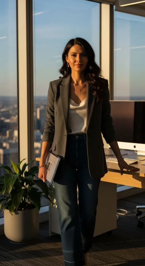 In offices that allow denim, straight dark jeans work best. Pair with a structured blazer and neat top.