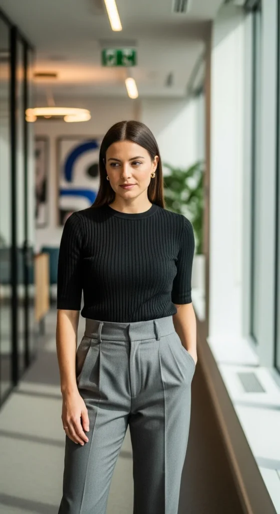 Ribbed tops feel soft and structured at the same time. Choose neutral shades for versatility.