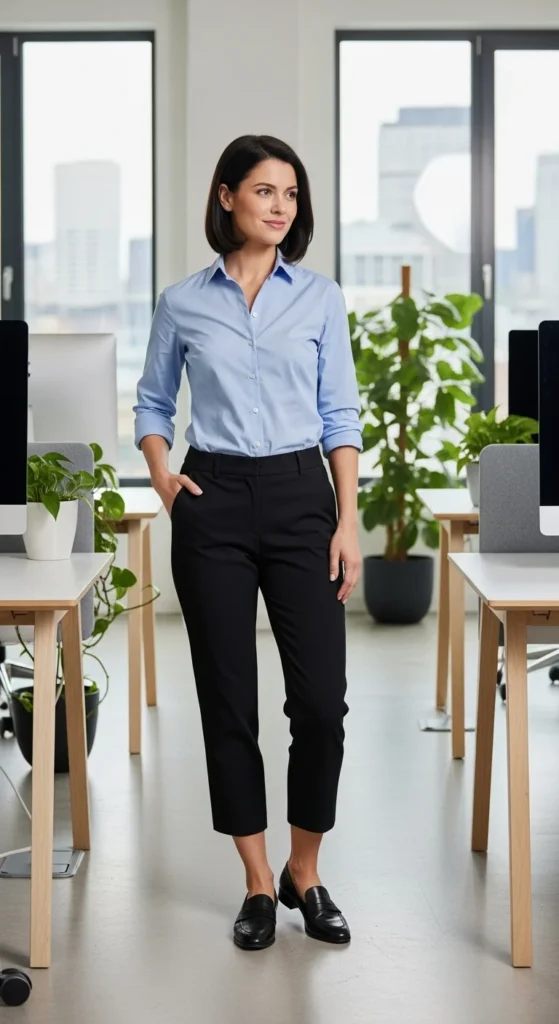 This combination works well for long days that involve sitting and standing. Stick to neutral tones for flexibility. If your shirt feels plain, add interest by rolling the sleeves neatly or choosing a subtle stripe. Comfortable loafers or pointed flats fit naturally here.