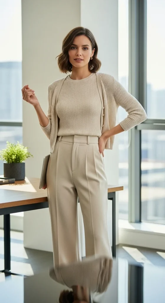 Neutral tones help the look repeat easily. Flats keep the outfit practical for walking between meetings.