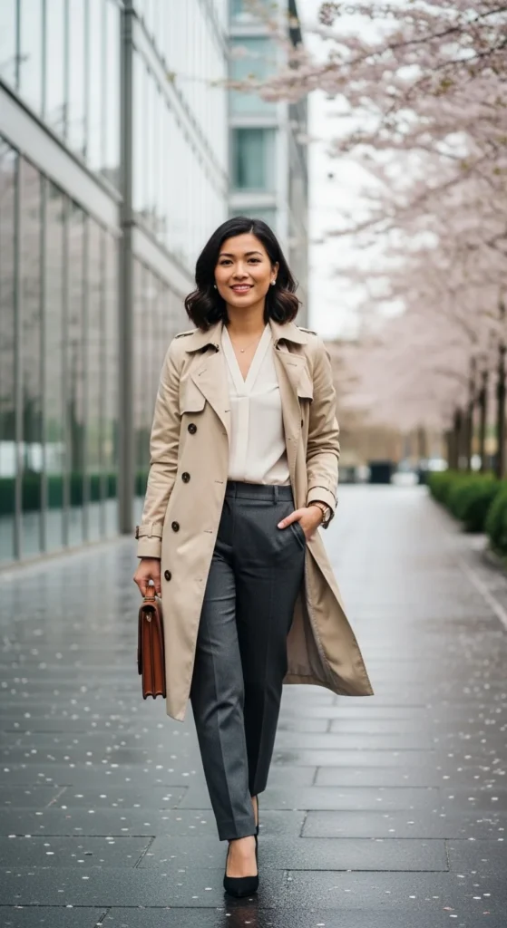 A trench coat works well during spring weather shifts. Wear it over simple office basics like a knit top and straight trousers. The coat adds polish without weight.