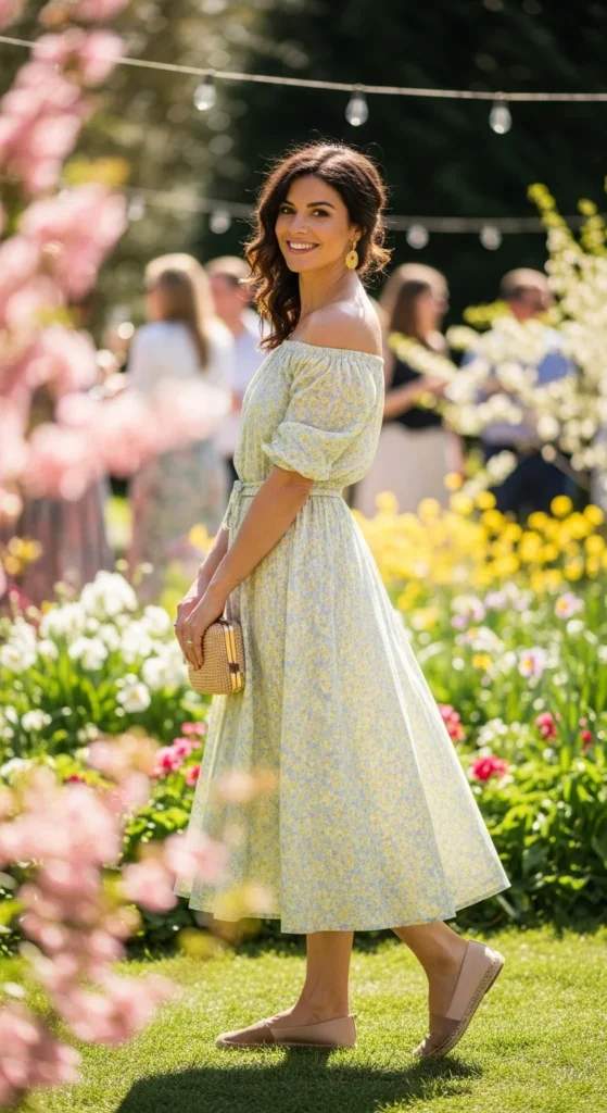 Off-shoulder styles feel relaxed and confident. Flats keep comfort high.