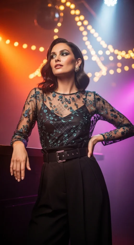 Sheer layers add texture and interest. High-waist pants keep balance.