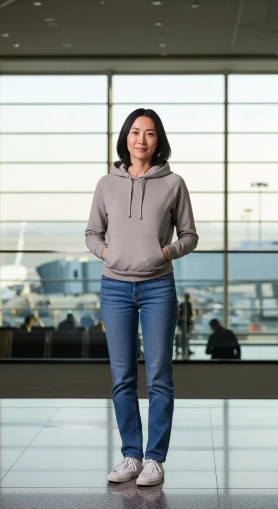 A hoodie keeps warmth during flights. Straight jeans keep the outfit tidy.