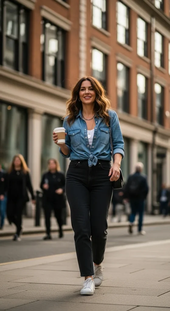 16. Denim Shirt and Black Jeans