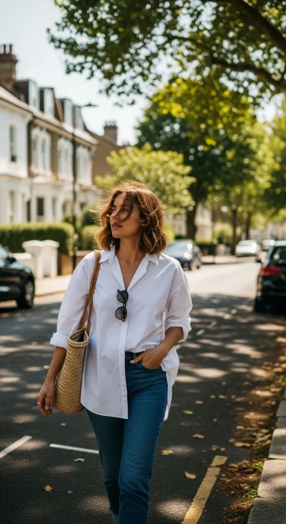 An oversized button-down gives instant ease. Wear it loose or partially tucked into relaxed denim. Lightweight cotton feels comfortable for daytime wear.