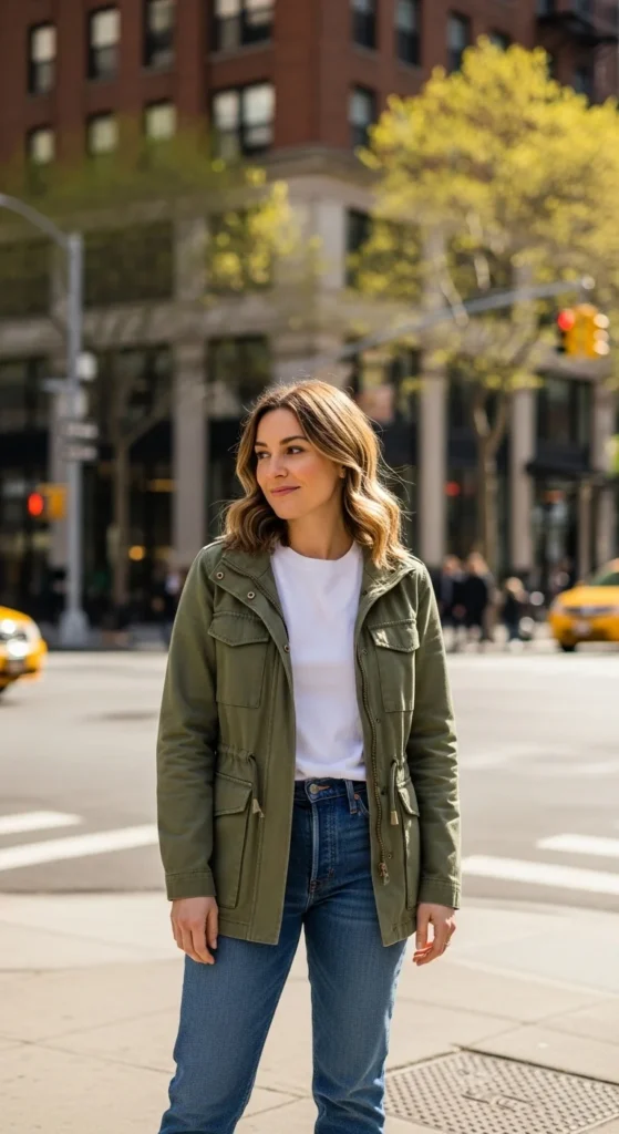 A light jacket pulls together a basic tee and denim. Utility or denim styles work well.