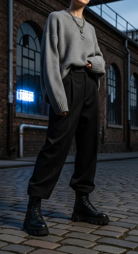If the top half is oversized, let the boots stay bold. Avoid dainty footwear here—chunky balances chunky.