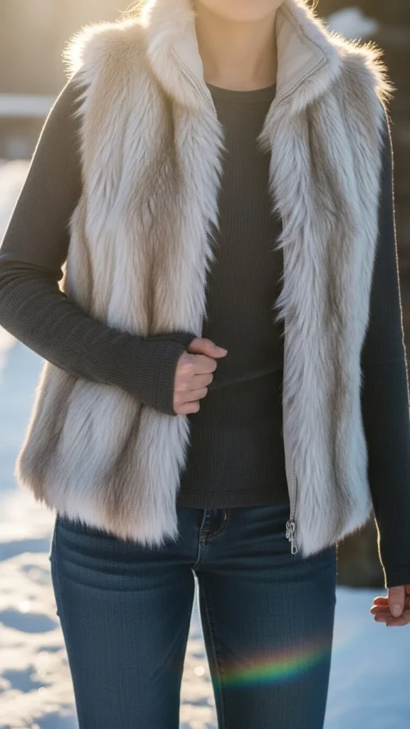 A thermal long sleeve keeps warmth close. A faux-fur vest adds texture. Jeans complete the outfit. This pairing suits casual winter outings. Choose thermal tops with snug sleeves. Add boots in warm tones. Keep accessories simple.