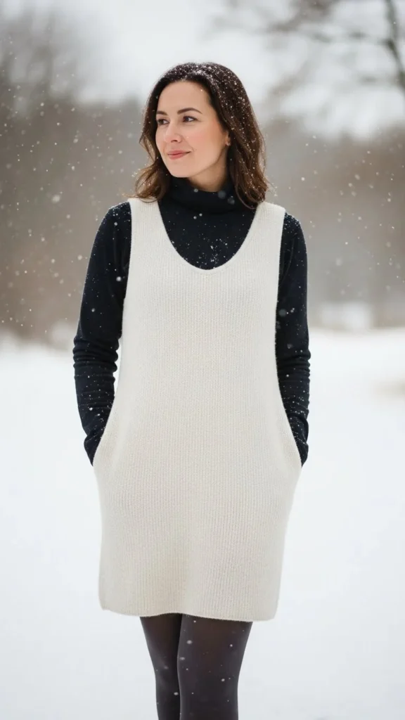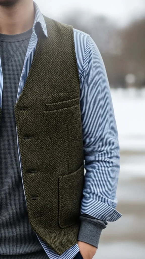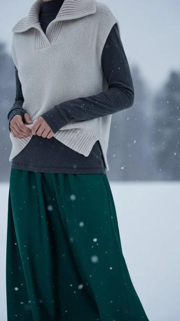 A thermal base adds warmth without altering shape. A sweater vest adds texture. Straight jeans keep the foundation simple. This pairing suits daily winter dressing. Choose vests in knit patterns. Add ankle boots or loafers.