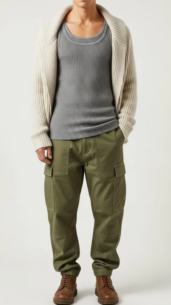 A thermal tank warms the torso. A ribbed sweater adds texture. Cargo pants add structure. This outfit suits relaxed winter activities. Choose neutral thermals that stay hidden. Add combat boots or winter sneakers.