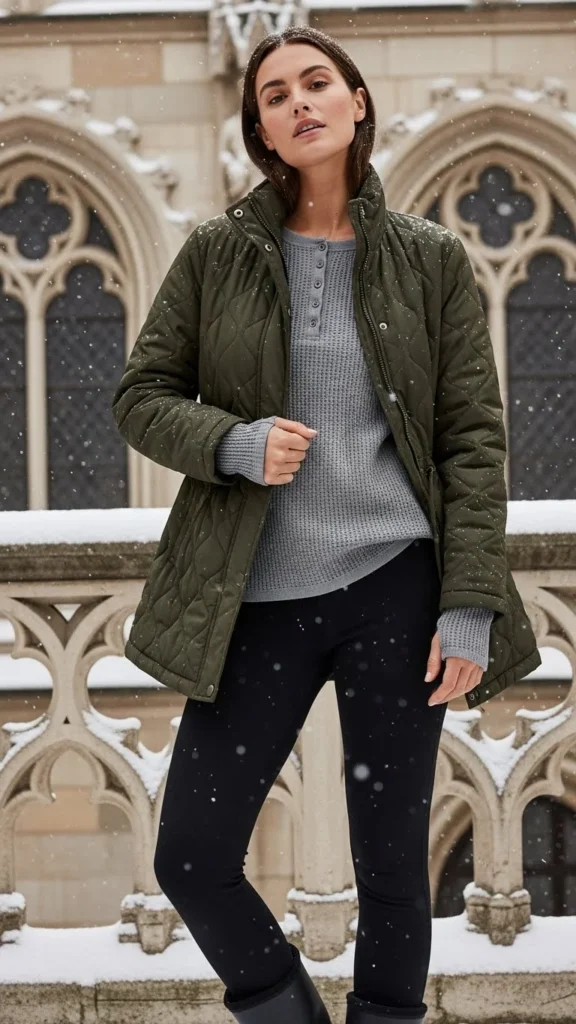 Quilted jackets pair well with thin thermal layers. Leggings keep movement unrestricted. This pairing suits cold outdoor days. Choose jackets in soft tones. Add gloves or a beanie for extra comfort.