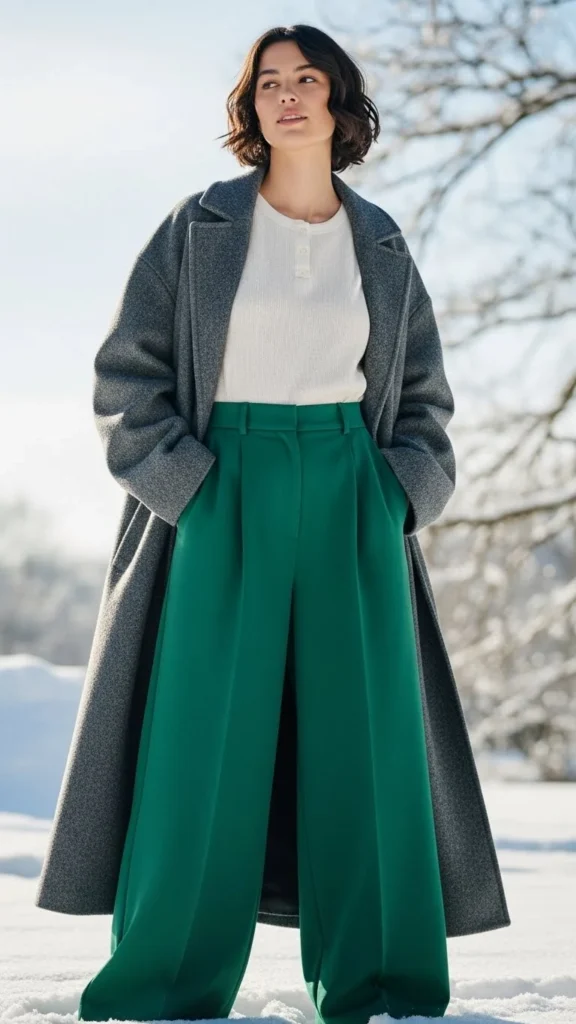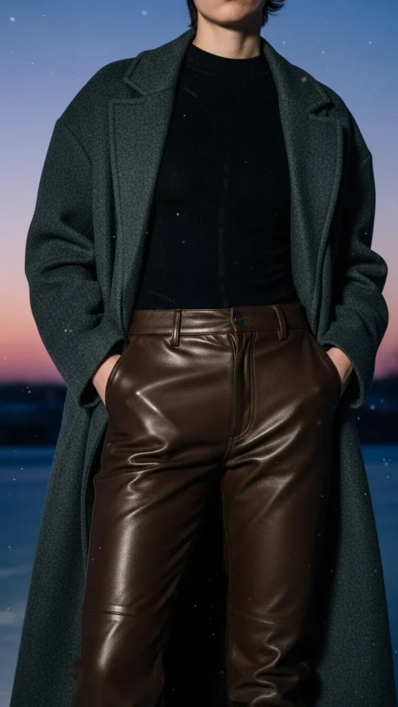 Leather pants add edge. A thermal bodysuit keeps heat in. The wool coat provides structure. This combination suits nights out or city events. Choose pants in faux-leather for affordability. Add heeled boots or loafers.