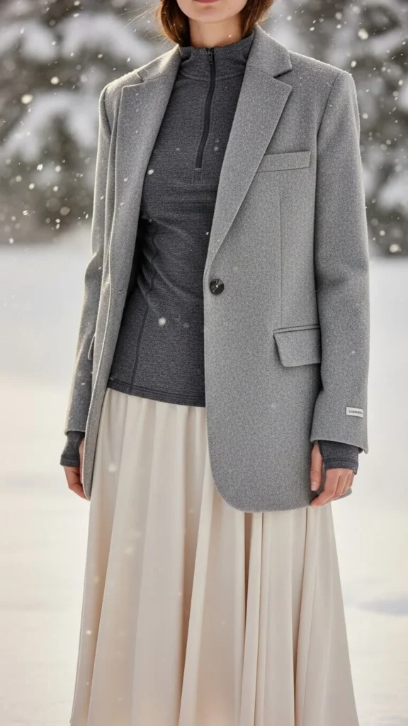 Pleated skirts move smoothly in winter air. A blazer coat adds polish. A thermal long sleeve keeps warmth near the skin. This combination suits dinners or outings. Add tights beneath the skirt. Choose boots that hit mid-calf.