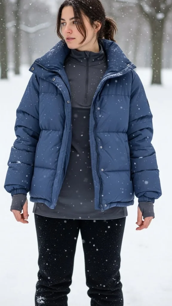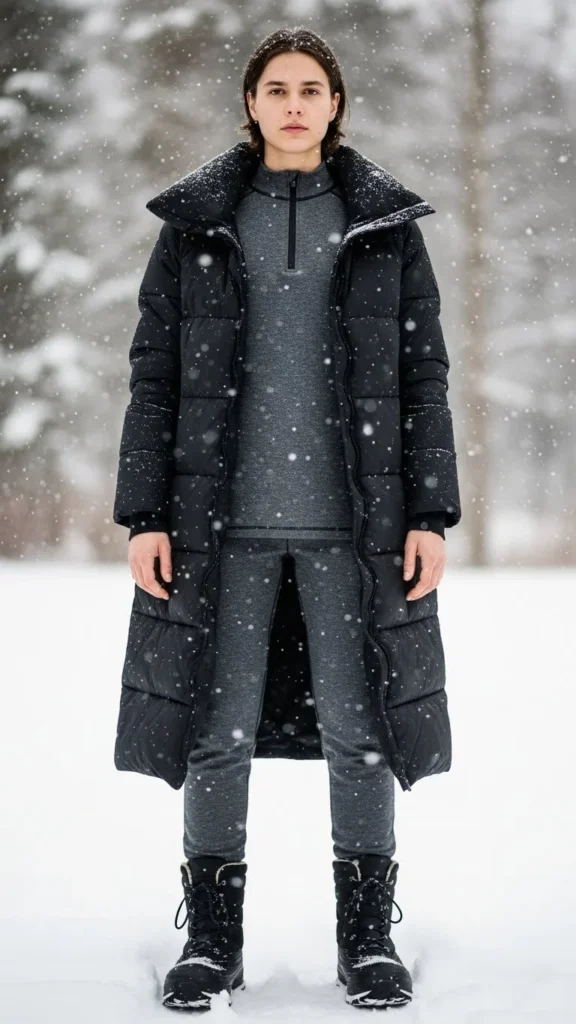 A complete thermal set offers full-body insulation. A long puffer coat seals in warmth. Boots protect against cold sidewalks. This pairing suits extremely cold days. Choose thermals with sturdy seams. Keep colours stable for easy layering.
