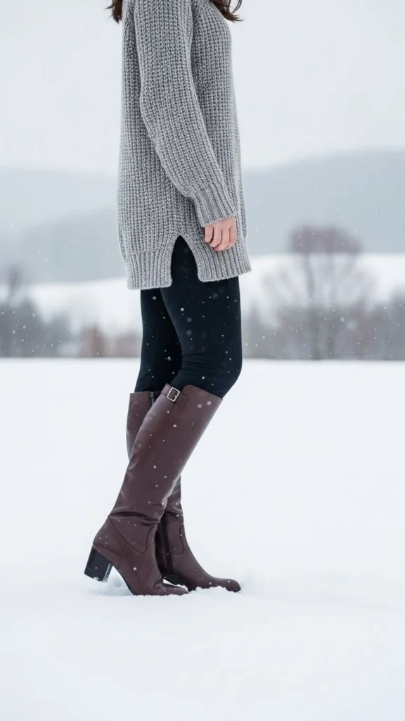 Thermal leggings add hidden insulation. A long sweater keeps things cozy. Knee-high boots protect your legs. This pairing suits relaxed winter activities. Add a belt if you want shape. Use socks inside boots for comfort.