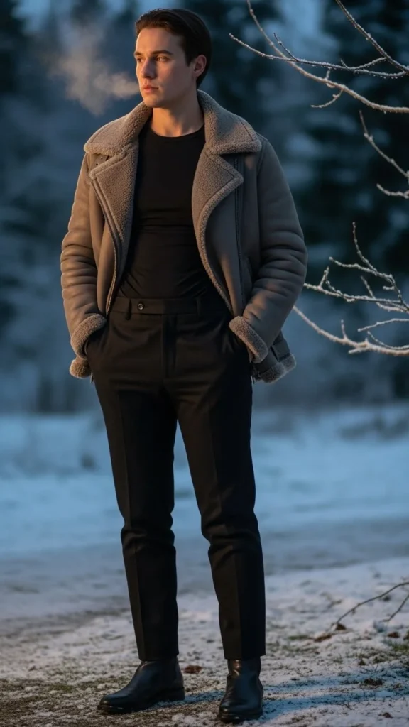 Shearling jackets offer strong warmth. Thermals support heat underneath. Fitted pants keep the shape tidy. This combination suits outdoor markets or city strolls. Choose pants in wool or thick denim. Add gloves depending on weather.
