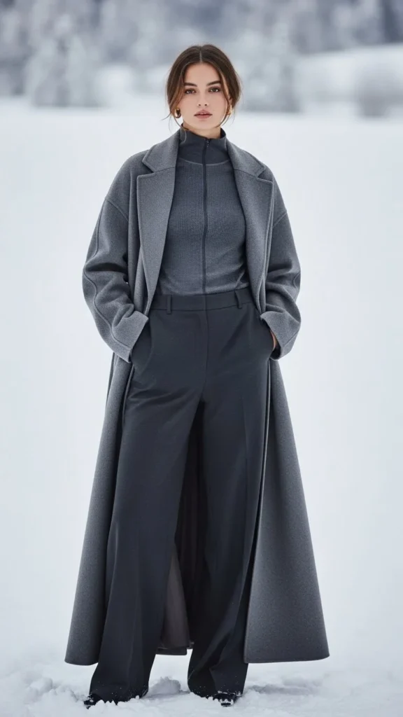 A thermal turtleneck adds heat near the throat. A maxi coat frames the outfit. Trousers keep the bottom half polished. This pairing suits commuting or work days. Choose coats with deep pockets. Add boots or loafers.