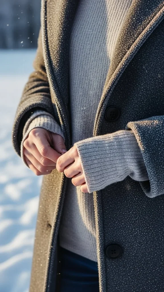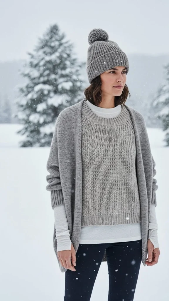 Layering soft knits over a thin thermal creates steady warmth. A neutral palette keeps everything cohesive. This combination suits quiet winter routines. Choose knits in beige, cream, or grey. Add wool trousers or jeans. Keep accessories subtle.