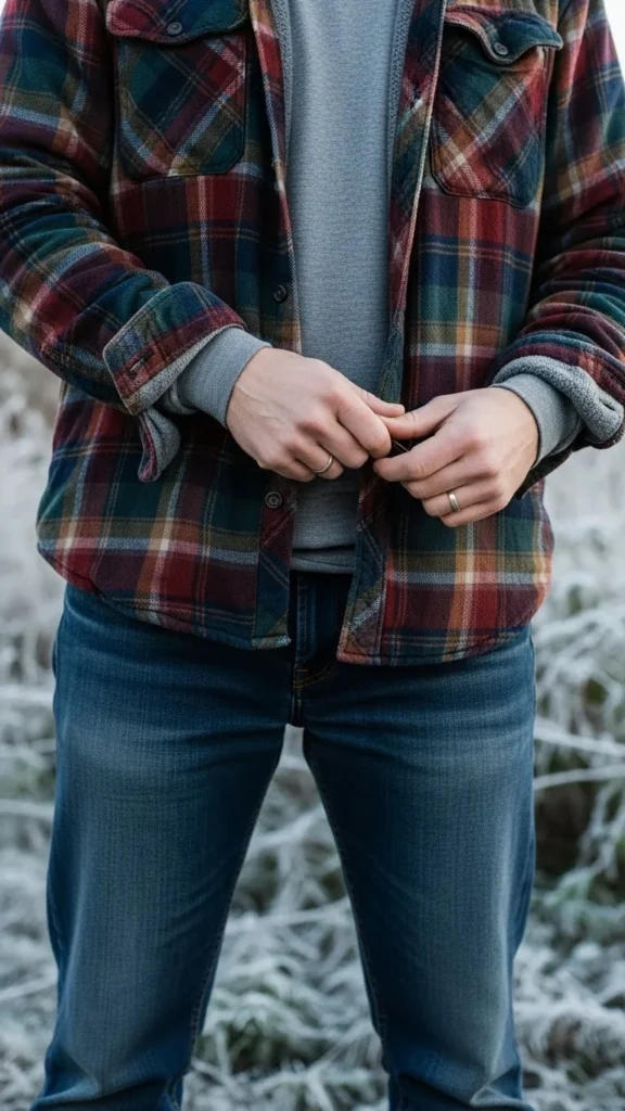 A thermal base traps heat. A flannel adds comfort and pattern. Dark jeans keep the look grounded. This outfit works for casual days. Choose flannels in warm tones. You can thrift many flannel options. Add lace-up boots for durability.