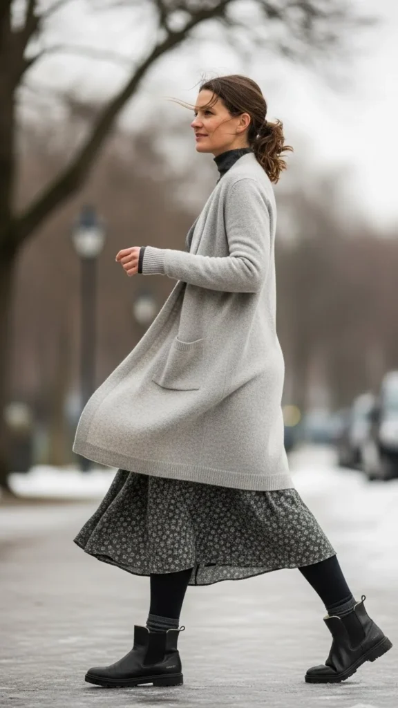 Thermal leggings add hidden warmth. A midi skirt moves easily. A longline cardigan creates flow. This combination suits mild winter days. Choose skirts in wool or ribbed knit. Add ankle boots for balance. Keep colours soft and neutral.
