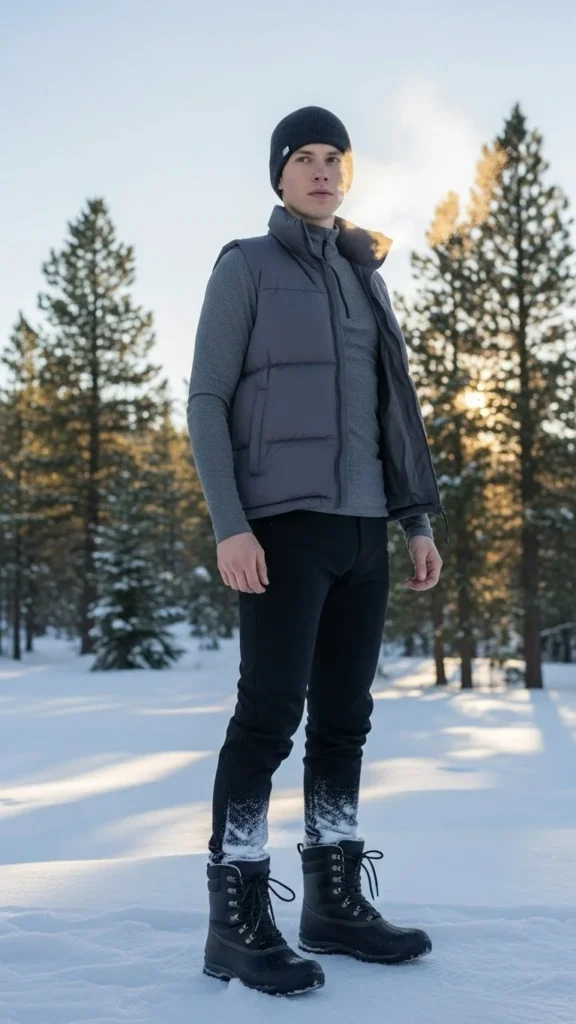 A thermal top supports warmth. A puffer vest adds lightweight insulation. Slim pants keep structure. This pairing suits outdoor errands. Choose a vest in muted tones. Add a beanie or gloves depending on temperature.