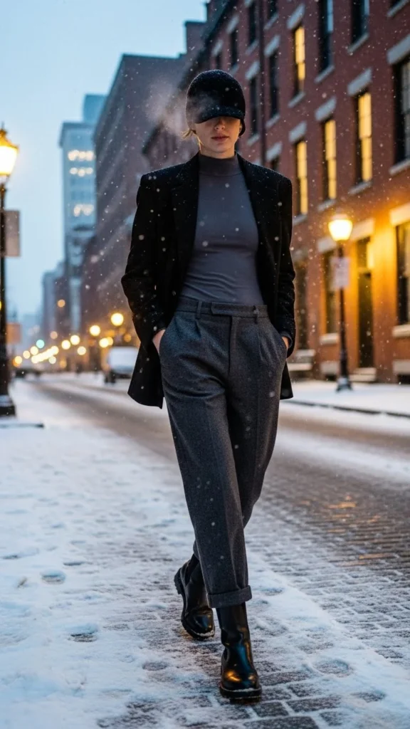 Thermal bodysuits stay tucked and smooth. Wool trousers add winter weight. A blazer sharpens the silhouette. This outfit suits professional settings. Choose bodysuits in thin fabrics to avoid bulk. Add a scarf if needed.