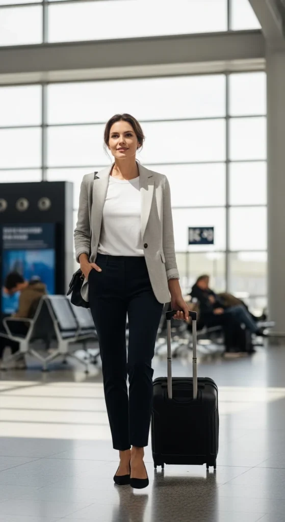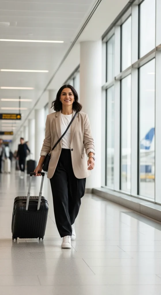 Airport outfits should be comfortable, breathable, and easy to layer. A blazer over a simple tee keeps things stylish without feeling stiff.
