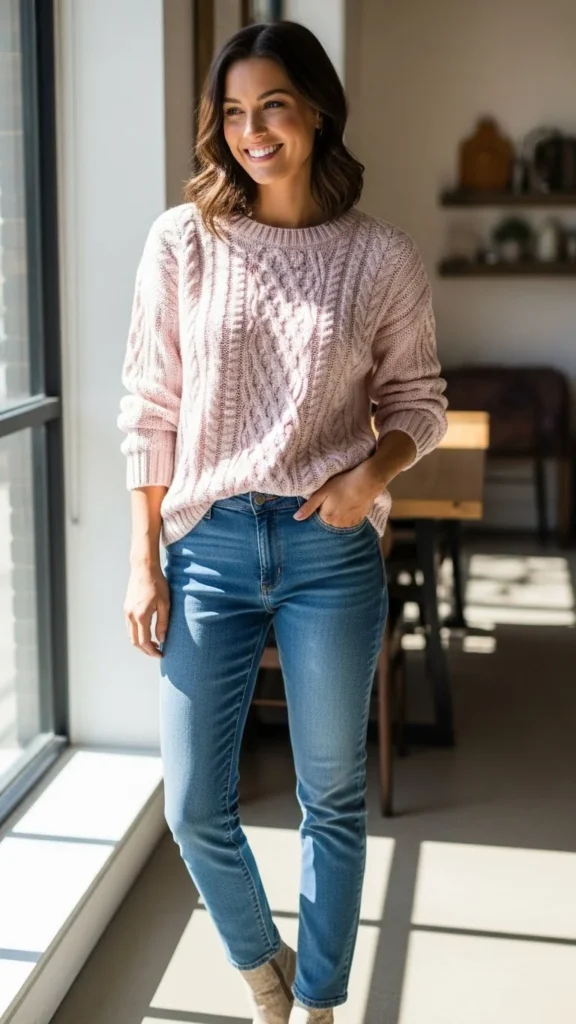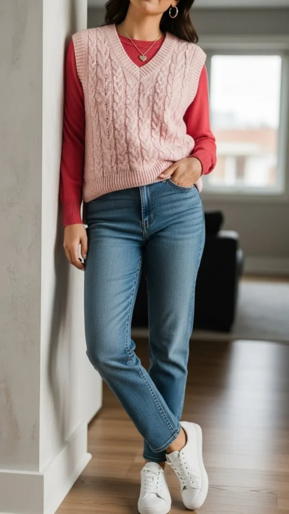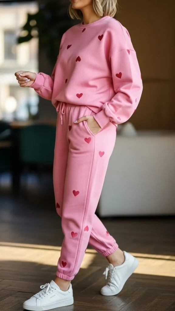 A pink sweatshirt instantly sets a Valentine tone while staying cozy. Straight-leg jeans keep the outfit relaxed and easy to move in. Choose soft cotton fabrics that feel good all day. Tuck the sweatshirt slightly in front if you want shape. White sneakers or slip-on flats complete the look. Budget tip: thrifted sweatshirts often look great after one gentle wash.