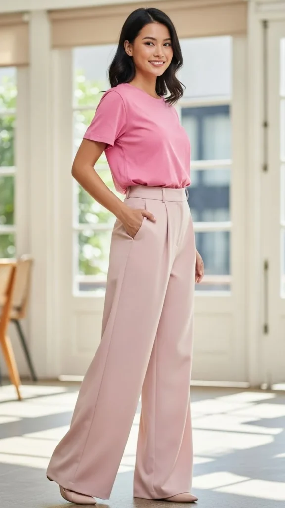 Wide-leg pants feel airy. Tuck the tee slightly. Budget tip: cotton tees are easy swaps.