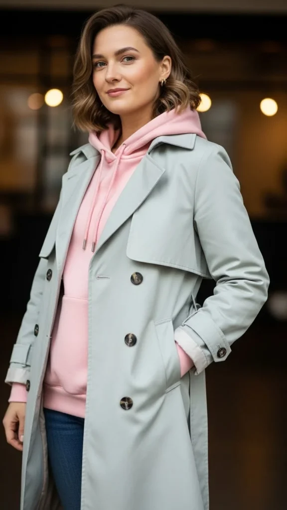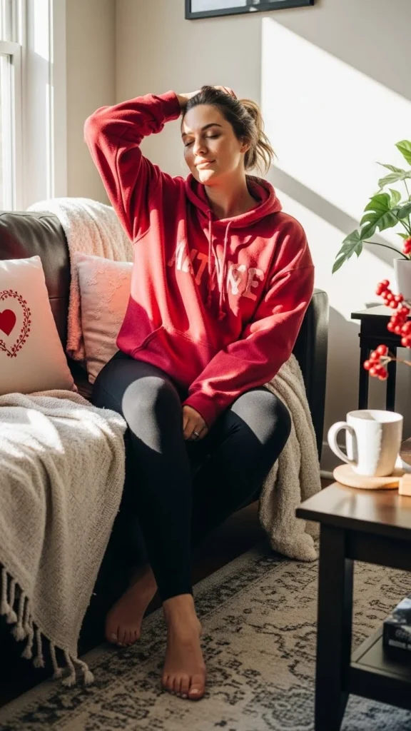 This outfit focuses on comfort while still looking intentional. Choose a hoodie in pink, cream, or soft red. Clean sneakers or slides finish the look. DIY idea: cuff the sleeves slightly to avoid a sloppy feel.