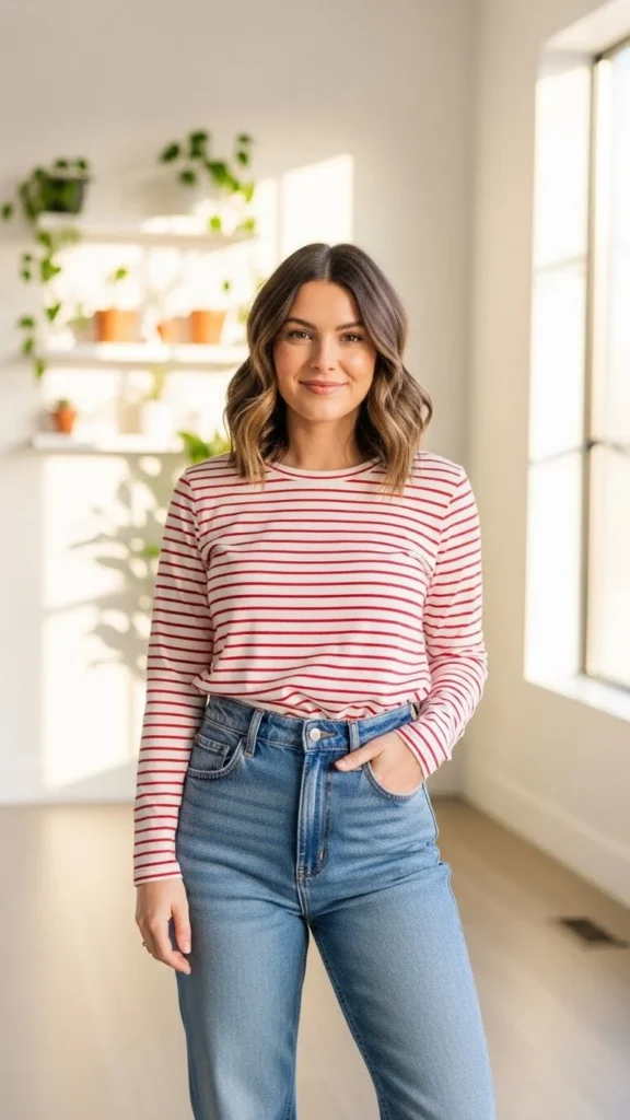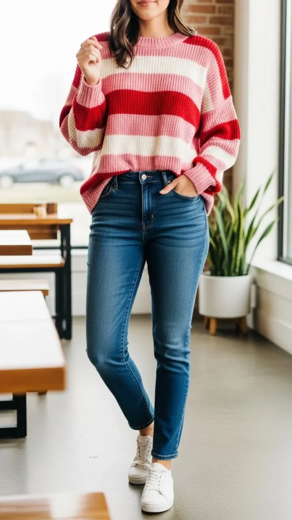 Stripes add interest without loud patterns. Choose soft colors for a Valentine feel. Budget tip: classic stripe tops are easy to find second-hand.