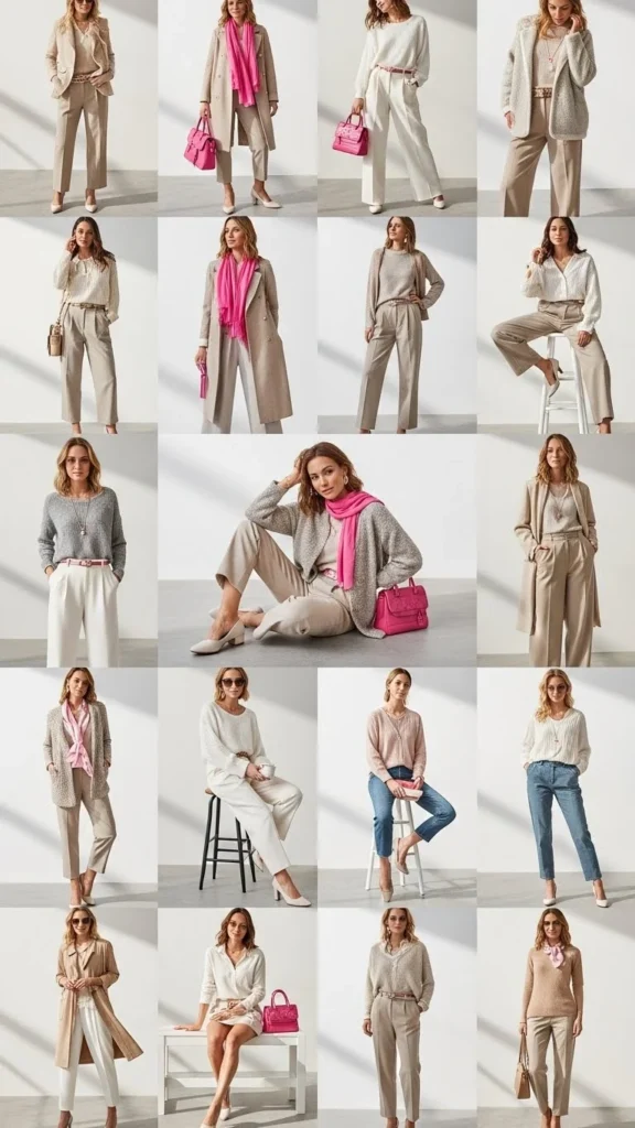 Matching sets look tidy with little effort. Add a pink bag or shoes. Budget tip: sets stretch across seasons.