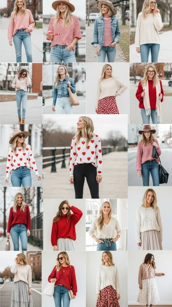 Valentine’s Day casual outfits are all about feeling relaxed while still looking thoughtfully styled. Many people search for ideas that feel cute and festive without feeling dressed up or restrictive. This list focuses on easy, wearable looks that work for coffee dates, casual walks, movie nights, or at-home plans. Each outfit idea uses comfortable basics, simple layers, and small Valentine touches that you can recreate without shopping stress.