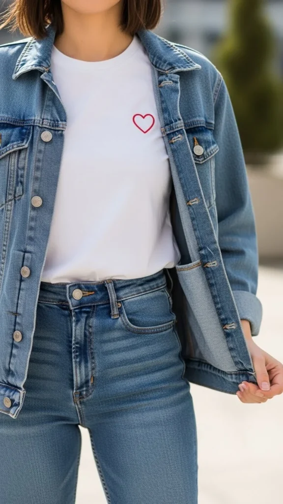 A denim jacket balances playful prints. DIY idea: pin a small heart badge for detail.
