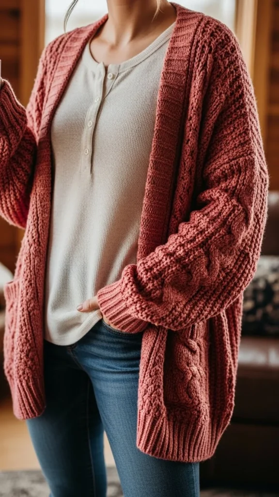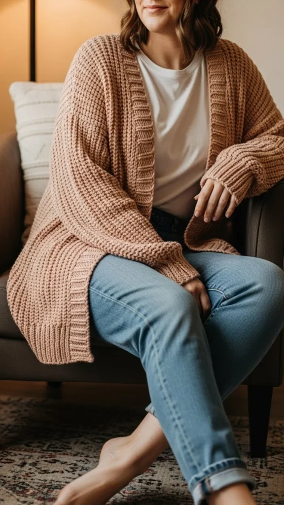 An oversized cardigan wraps you in warmth without feeling heavy. Layer it over a cotton tee and denim. Leave it open for ease. DIY idea: add a fabric belt to change the shape.