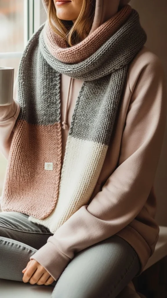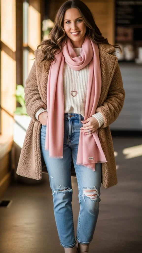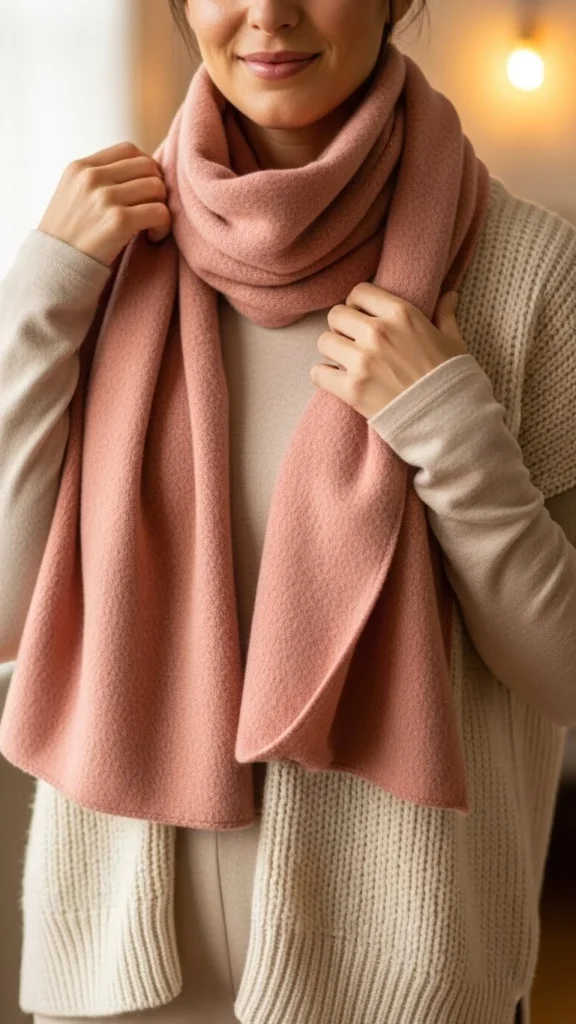 Scarves add warmth and texture. Wrap loosely for comfort. DIY idea: reuse scarves in Valentine tones.