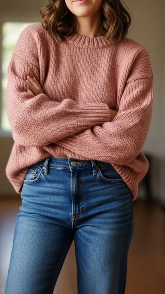 A chunky knit sweater feels comforting the moment you put it on. Pair it with straight jeans for balance. Soft shades like cream or blush feel gentle and welcoming. Roll the sleeves slightly for a relaxed touch. Clean sneakers or ankle boots work well. Budget tip: thrift shops often carry high-quality knits at low prices.