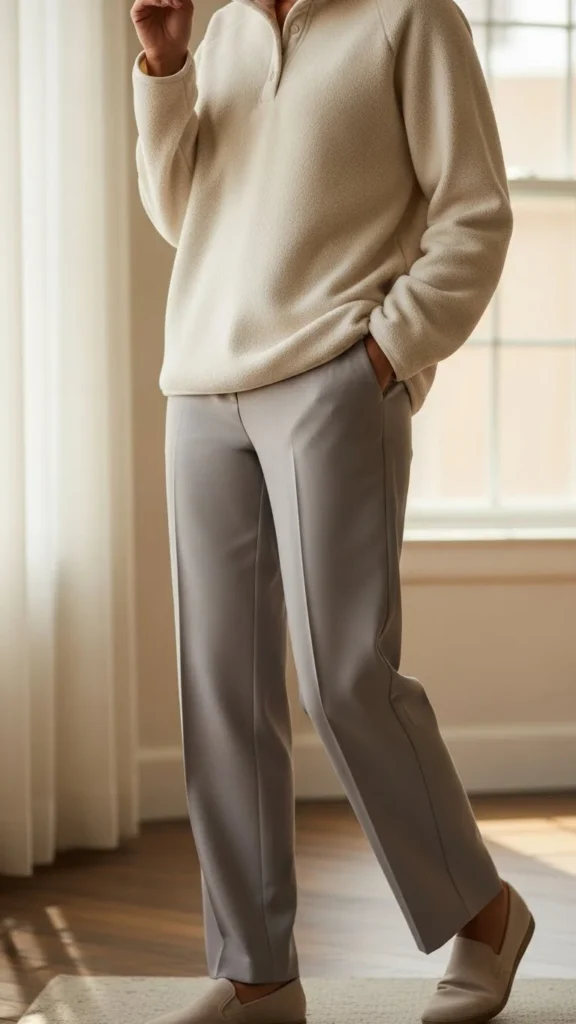 This outfit balances comfort and structure. Choose brushed fabrics. DIY idea: tuck slightly at the front.