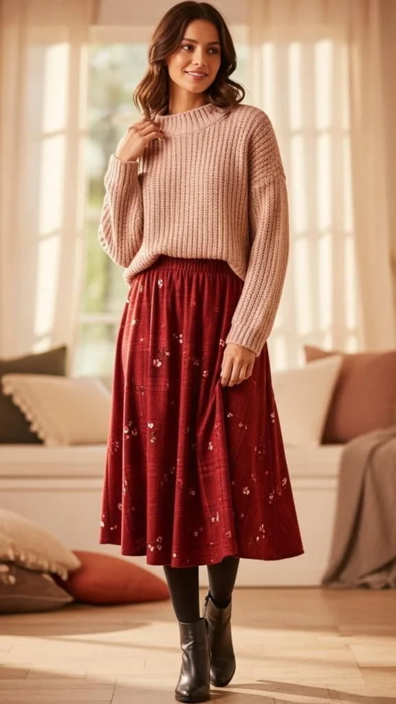 Knit dresses feel soft and easy. Tights add warmth. Flats or boots complete the look. Budget tip: classic knit dresses age well.