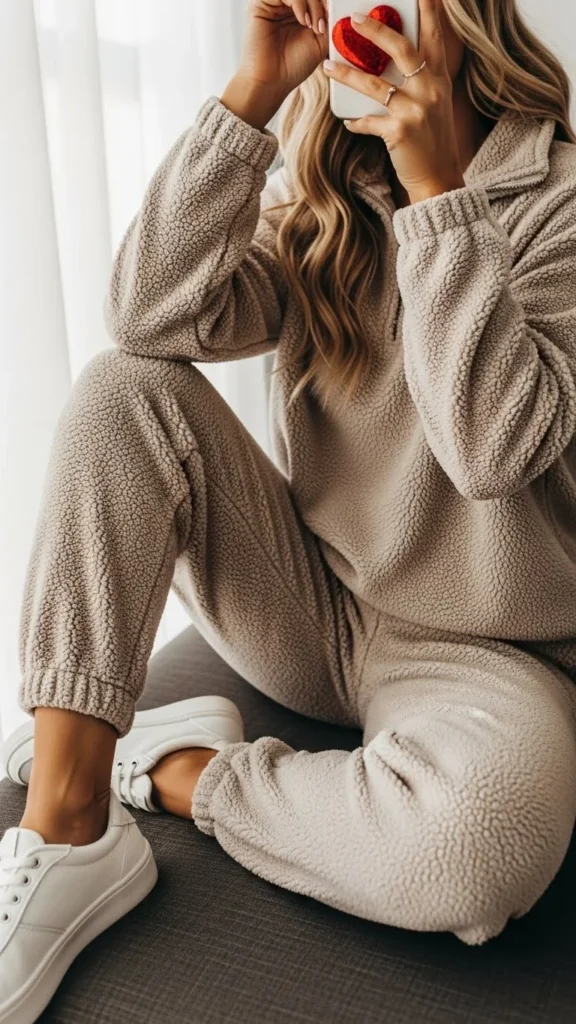 Matching lounge sets feel tidy and comfortable. Soft pink adds Valentine warmth. Wear indoors or out with sneakers. Budget tip: sets stretch across many occasions.