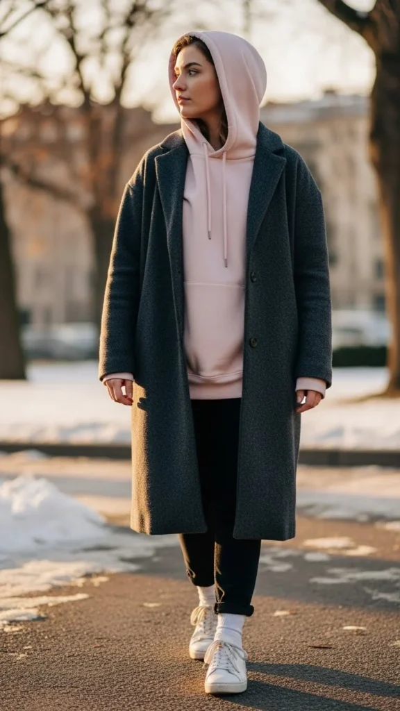 Layering a hoodie under a coat keeps warmth close. Neutral coats balance casual pieces. DIY idea: choose a hoodie in blush or soft red.