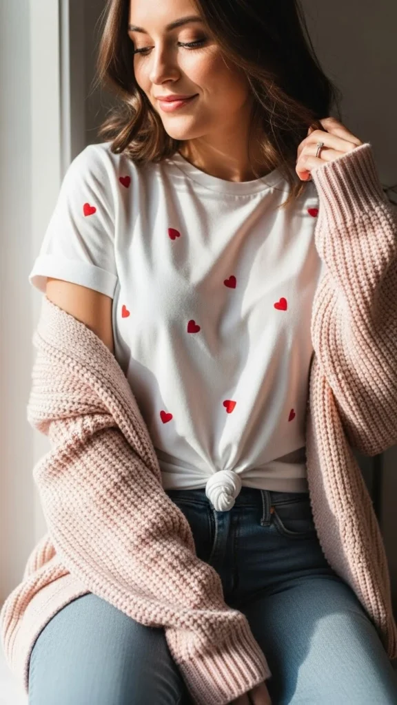 Playful prints add sweetness. Layer with a cardigan for warmth. Keep colors gentle. DIY idea: iron-on heart patches refresh old tees.
